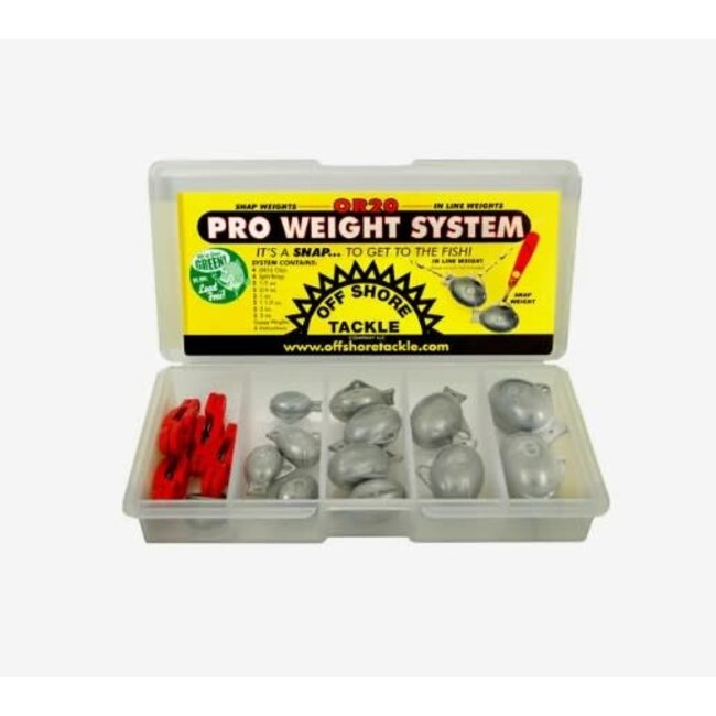 Chaque système est livré avec des instructions détaillées, quatre OR16 Pro Snap Weight Clips, quatre anneaux fendus, et deux de chaque Pro Guppy Weights : 1/2 oz, 3/4 oz, 1 oz, 1 1/2 oz, 2 oz et 3 oz, le tout bien rangé dans une boîte à pêche en plastique. Ce système peut être utilisé comme poids à pression ou poids en ligne, parfait pour les lignes plates, les planches à double et triple planer, ainsi que les planches à planer latérales.