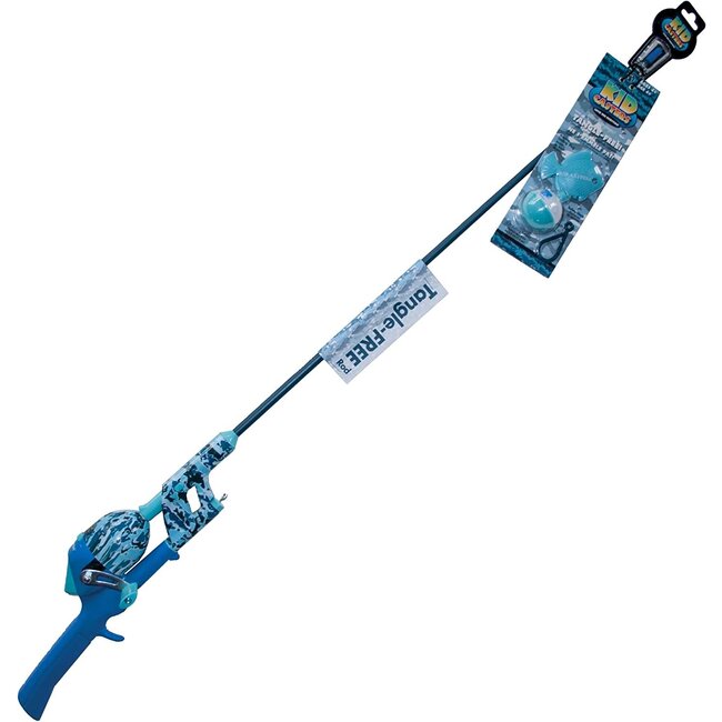 The Kid Casters Tangle-FREE Combo comes equipped with a 34″ inline rod and reel combo. The innovative Tangle-FREE designs feeds the line through the center of the shaft rather than through traditional guides, allowing for a smooth Tangle-FREE cast everytime! The reel features a 3.3:1 gear ratio and comes pre-spooled with 6lb line. The combo includes a plastic casting plug, rattle bobber, and a pre-tied snap swivel. The Kid Casters No Tangle Combo is perfect for teaching kids how to fish and truly a parent’s dream come true!