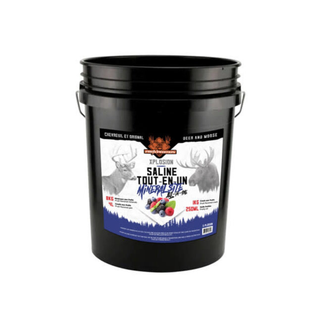 Our complete saline kit, suitable for all types of cervids, includes 8 kg of minerals, 1 kg of fruit-flavored AKCRO (highly volatile calcium attractant powder), 4 L of fruit coulis, and 250 ml of highly aromatic fruit-scented oil. Simply bring your boiler directly to your hunting site and create a salt lick in no time. This kit provides a convenient and effective solution to attract cervids to your hunting area.