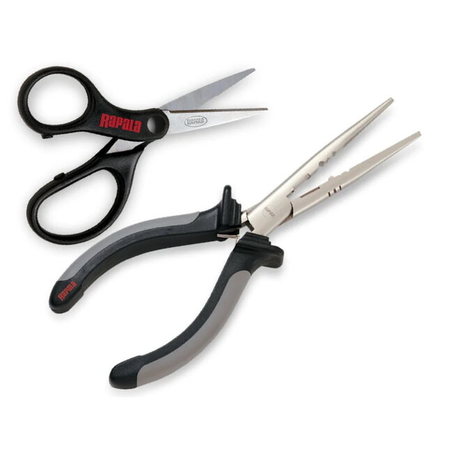 The Pliers & Super Line Scissors Combo includes the reliable Rapala Fisherman's Pliers, built for years of dependable use. Made from durable carbon steel with a nickel-plated finish, these pliers feature co-molded grips for comfort and a double leaf spring for effortless operation. The set also includes a split shot crimper, a Rapala® lure tuning tool, and light-duty side cutters. The accompanying Super Line Scissors boast a sharp serrated edge and large finger and thumb holes, allowing for a secure grip on braided line for smooth, non-slip cutting.